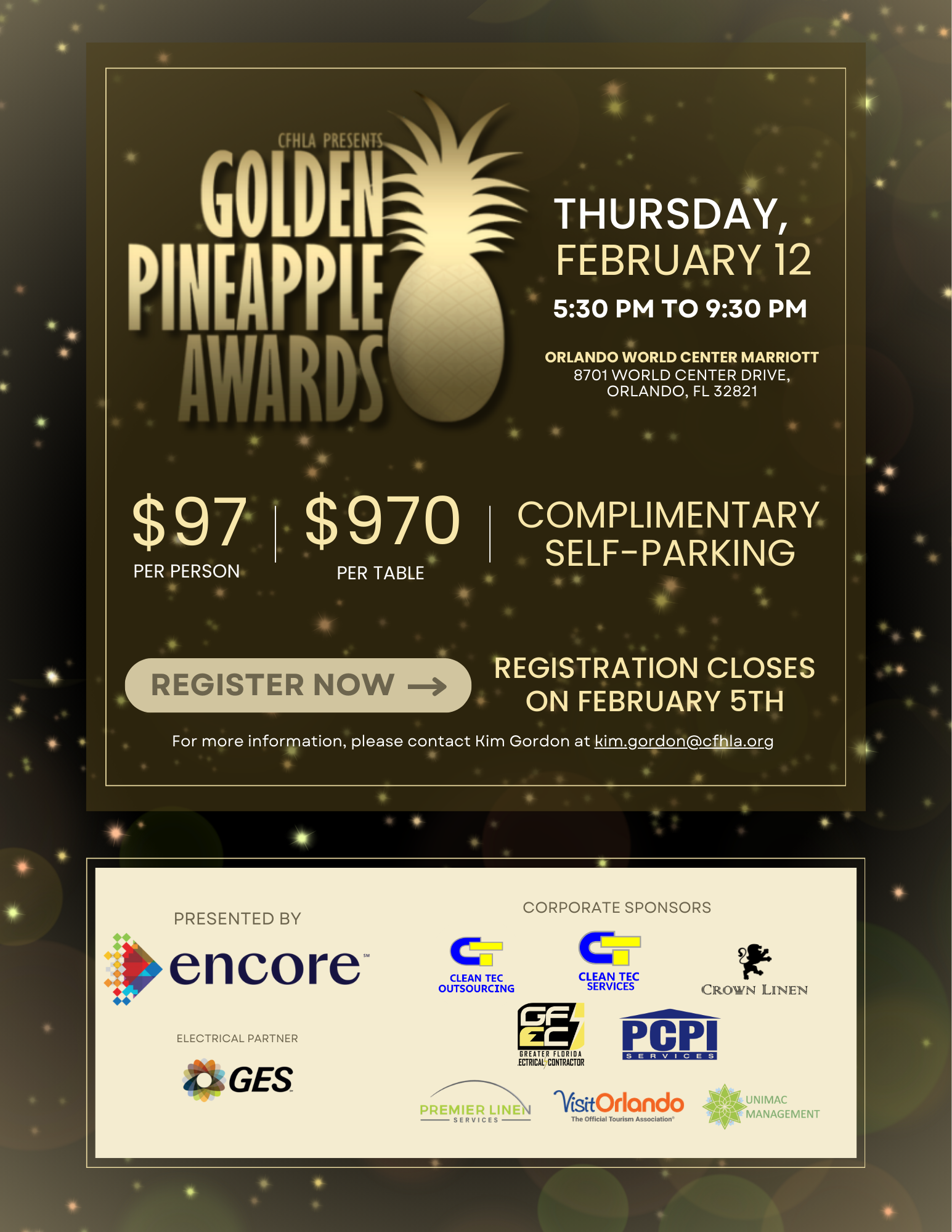 CFHLA still has a variety of sponsorship opportunities available including five (5) remaining for the upcoming annual Golden Pineapple Awards Dinner, scheduled for Thursday, February 12, at the Orlando World Center Marriott. With more than 1,000 lodging professionals in attendance, the Golden Pineapple Awards is wonderful opportunity to celebrate and honor the front-line and hourly employees who make our industry shine every day. This program recognizes excellence across 13 award categories, with 13 winners selected and more than 300 nominees celebrated on stage. One of the most memorable moments of the evening is watching nominees proceed down the aisle, by category, as their peers and leaders cheer them on. This year, the sponsorship is $2,300 and includes the following benefits: