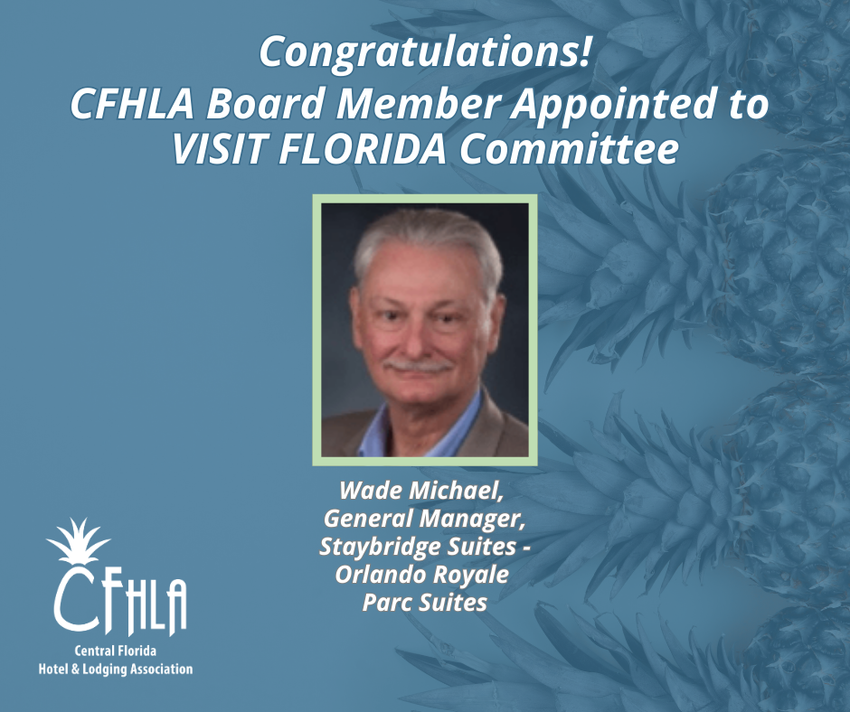 We are proud to share that CFHLA Board Member Wade Michael, General Manager of Staybridge Suites – Orlando Royale Parc Suites, has been appointed to serve on VISIT FLORIDA’s Industry Services Committee through June 30, 2026.