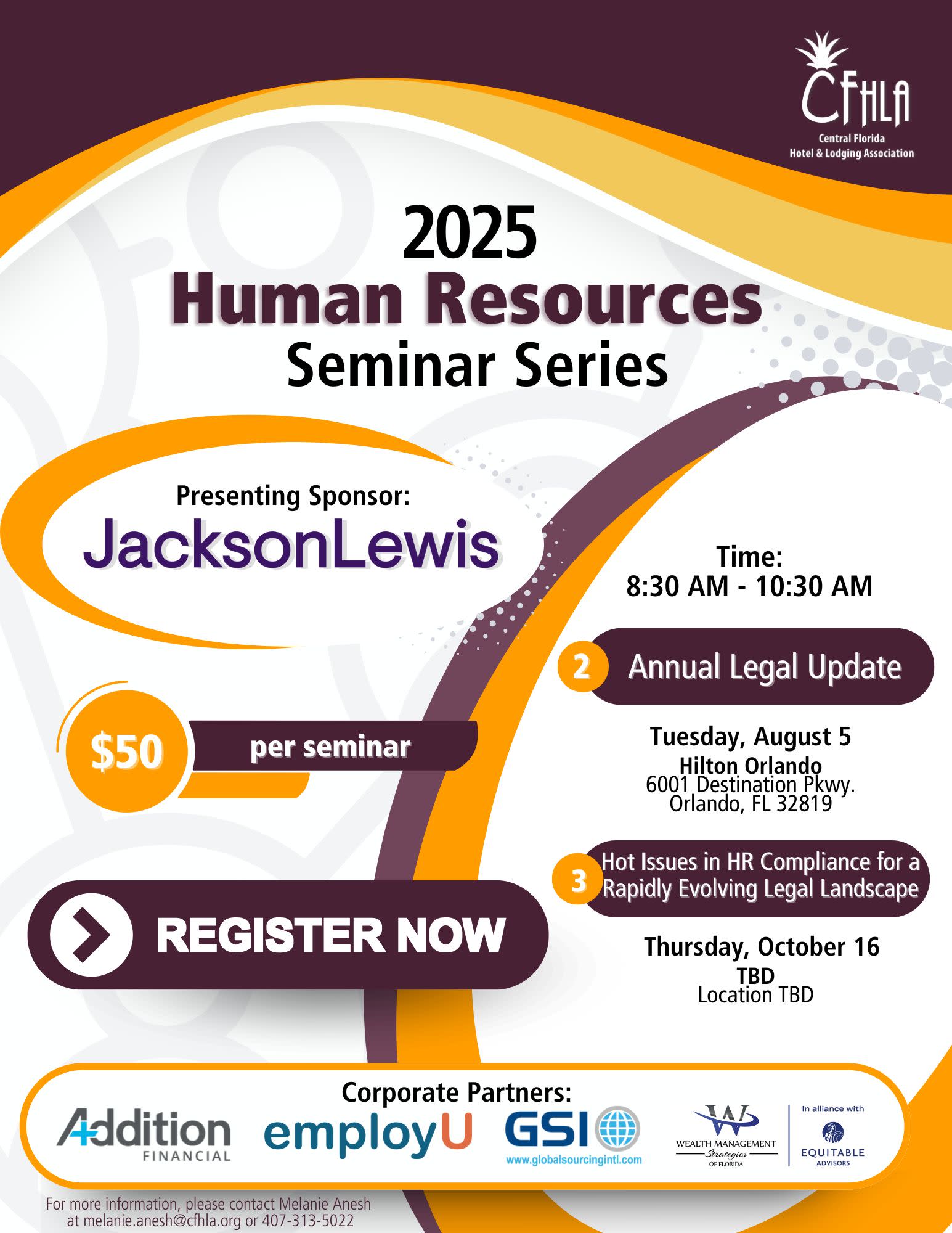 - 8:30 am - 10:30 am: Human Resources Seminar #2 – 2025 Annual Legal Update: Stay informed on the latest HR regulations, compliance updates, and legal trends affecting the hospitality industry.