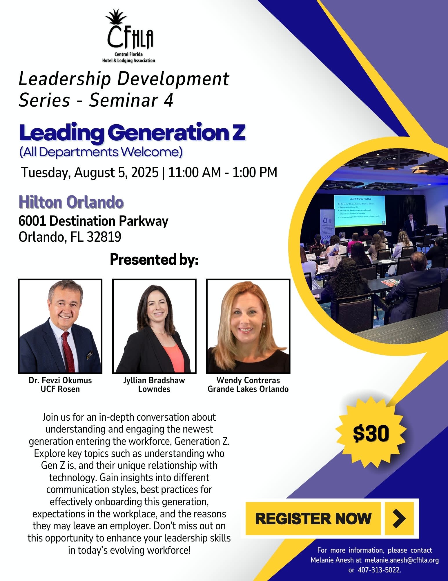- 11:00 am - 1:00 pm: Leadership Development Seminar #4 - Leading Generation Z: Gain insights and strategies for effectively managing and motivating the next generation of hospitality professionals.