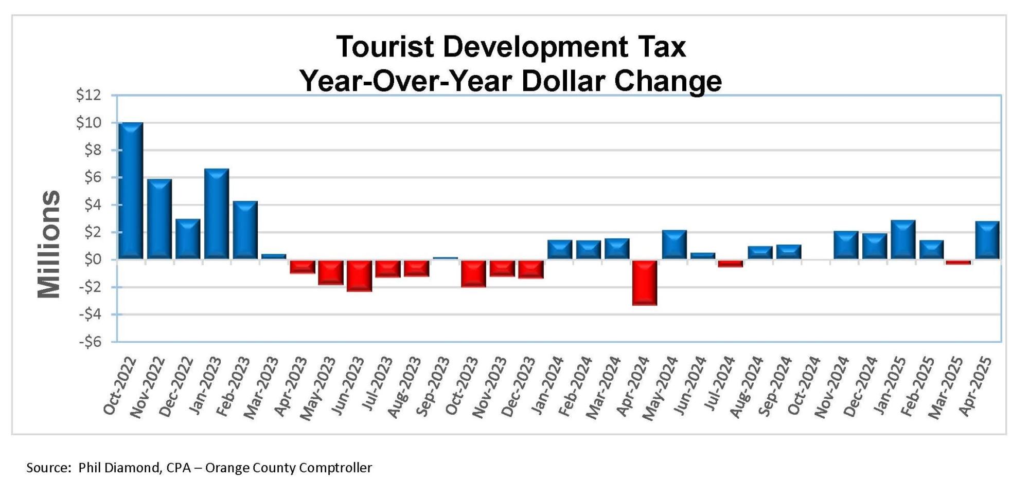 The Tourist Development Tax (TDT) collections received by Orange County for April 2025 were $33,124,300. That is a 9.3% increase compared to April 2024.