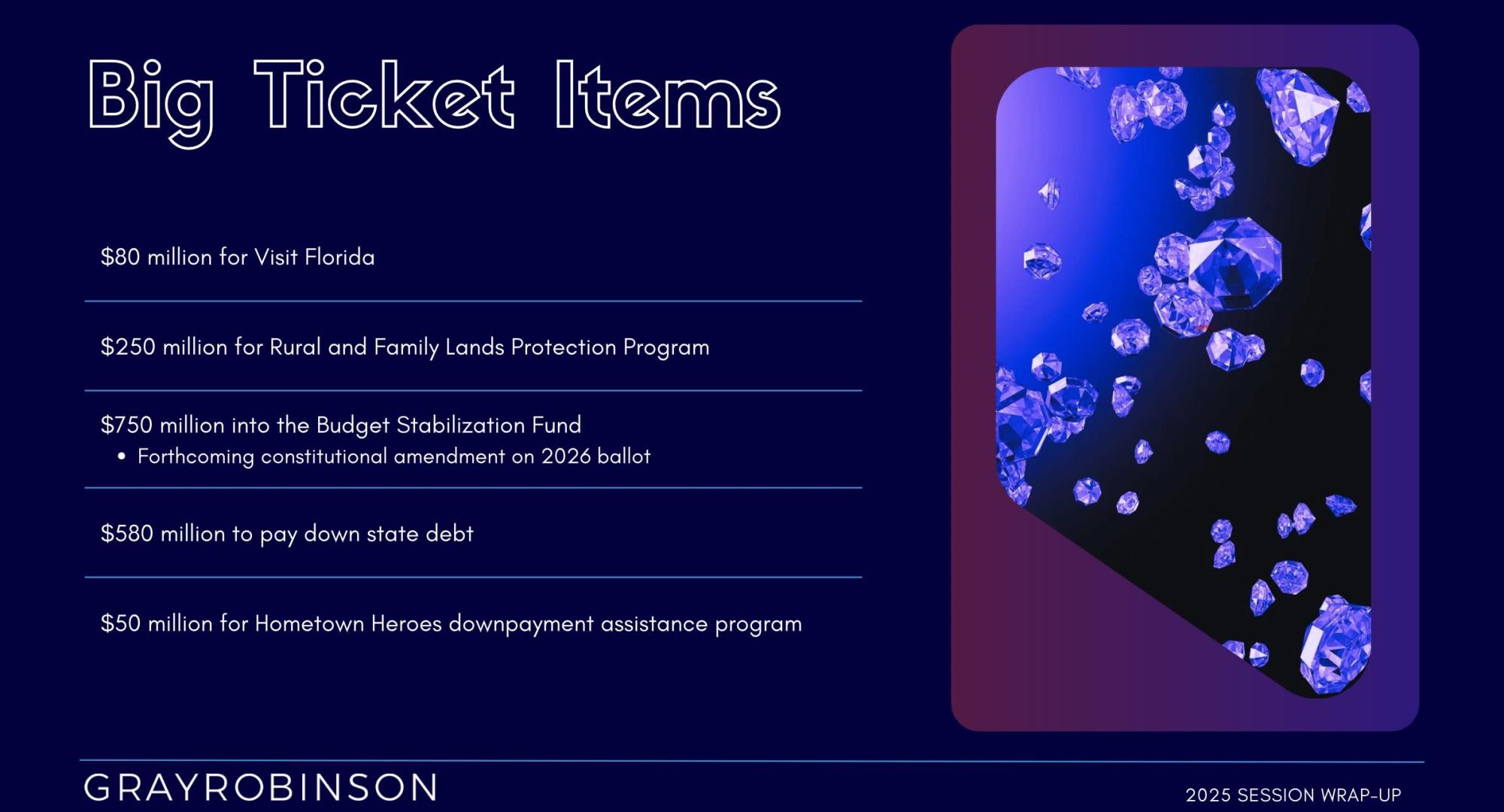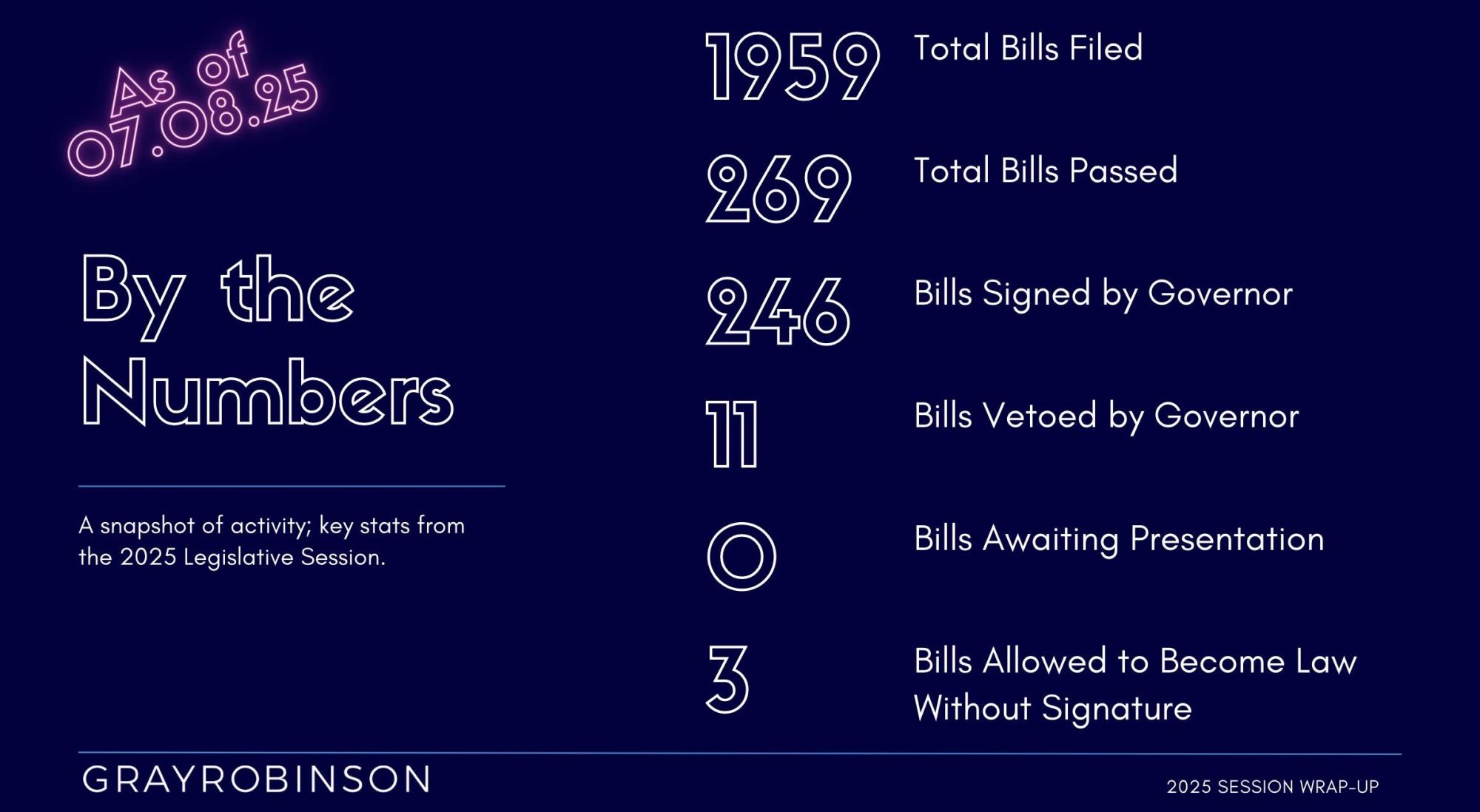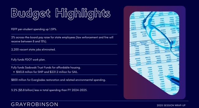 After a lengthy legislative session which lasted 105 days - one of the longest in Florida history - the Florida Legislature officially adjourned sine die the 2025 Legislative Session on June 17, 2025. Then Governor DeSantis signed the General Appropriations Act (SB 2500), the annual tax package (HB 7031) and a series of related budget bills over the past few weeks.