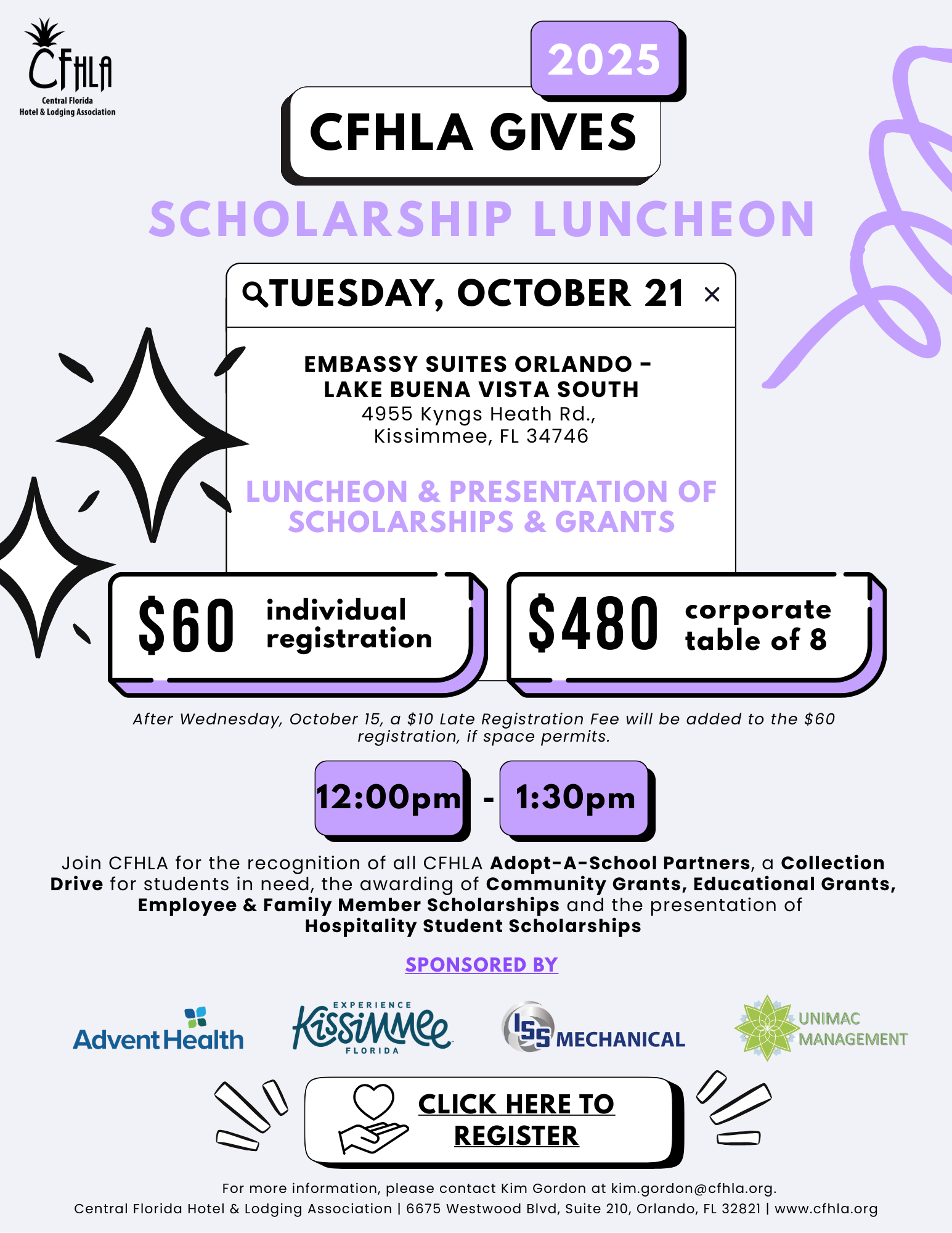 Don’t miss the 2025 CFHLA Gives – Scholarship Luncheon that will be held on Tuesday, October 21, 2025, at the Embassy Suites by Hilton Orlando Lake Buena Vista South.